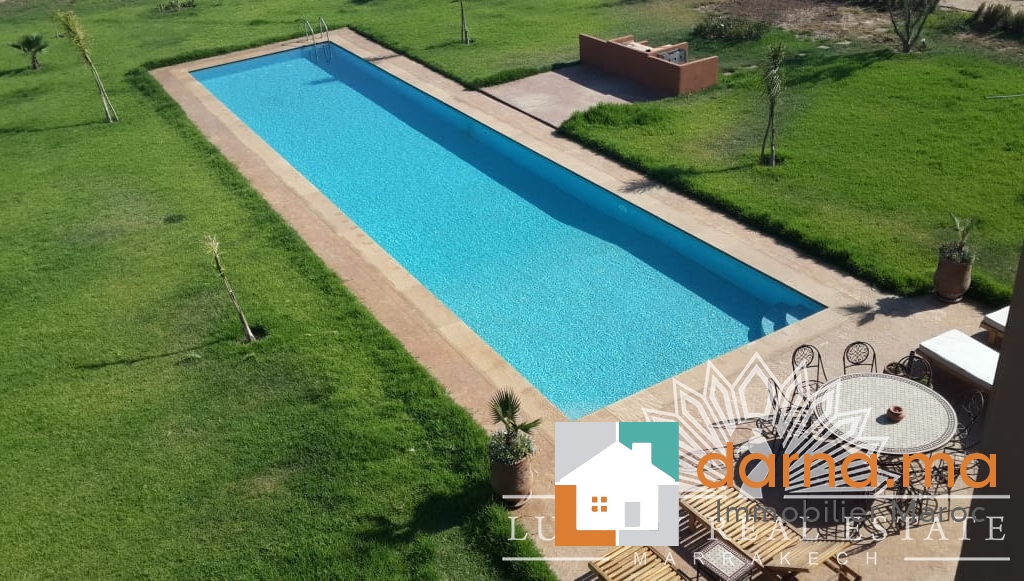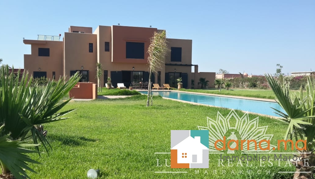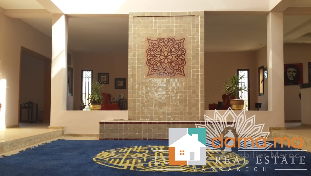 Villa route du barrage, 1 hectare de jardin, 550m² de superficie construite, style riad moderne, 5 chambres à coucher dont une suite parentale à l’étage, vue imprenable sur l’atlas.