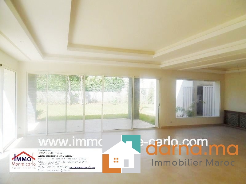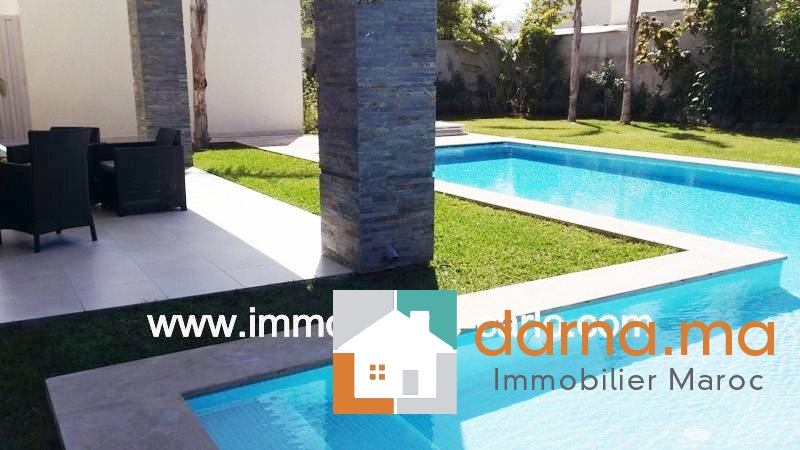 A louer villa neuve moderne à Rabat, villa très agencée avec piscine, chauffage central, climatisation, cheminée, beau jardin, garage automatique, vidéophone, Bénéficiant de prestations haut de gamme, finitions et matériaux de luxe, située sur une rue tranquille en plein cœur d’un quartier branché et résidentiel, villa  composée de double salons avec un coin cheminée, salle à manger, salle d’eau des invités, 4 chambres : une suite parentale avec salle de bain et dressing, grande terrasse, chambre amis avec dressing et salle de bain 2chambres à coucher chacune avec sa salle de bain et grands placards, balcons, cuisine bien équipée, buanderie, logement de personnel,….
