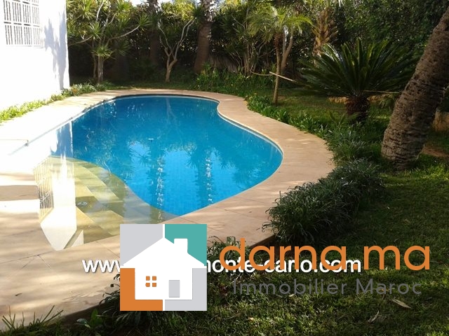 À louer villa moderne 5 étoiles meublée avec piscine chauffée dans un jardin clôturé, paysager. Superbe vue sur la piscine. Terrasses autour de la piscine  avec mobilier en teck, barbecue,construite sur 3 niveaux et composée de: Rez de chaussée spacieux et lumineux  avec terrasse donnant sur la piscine et le jardin, comprenant  triple salons, coin cheminée, séjour, WC des invités,  cuisine neuve équipée moderne, buanderie, cour. Étage: suite parental avec dressing, salle de bain et grande terrasse, 3 chambres à coucher  chacune avec sa salle de bain et dressing et terrasse privée, Sous-sol : salon, douche, WC, chambre, débarras,buanderie, logement de personnel ….