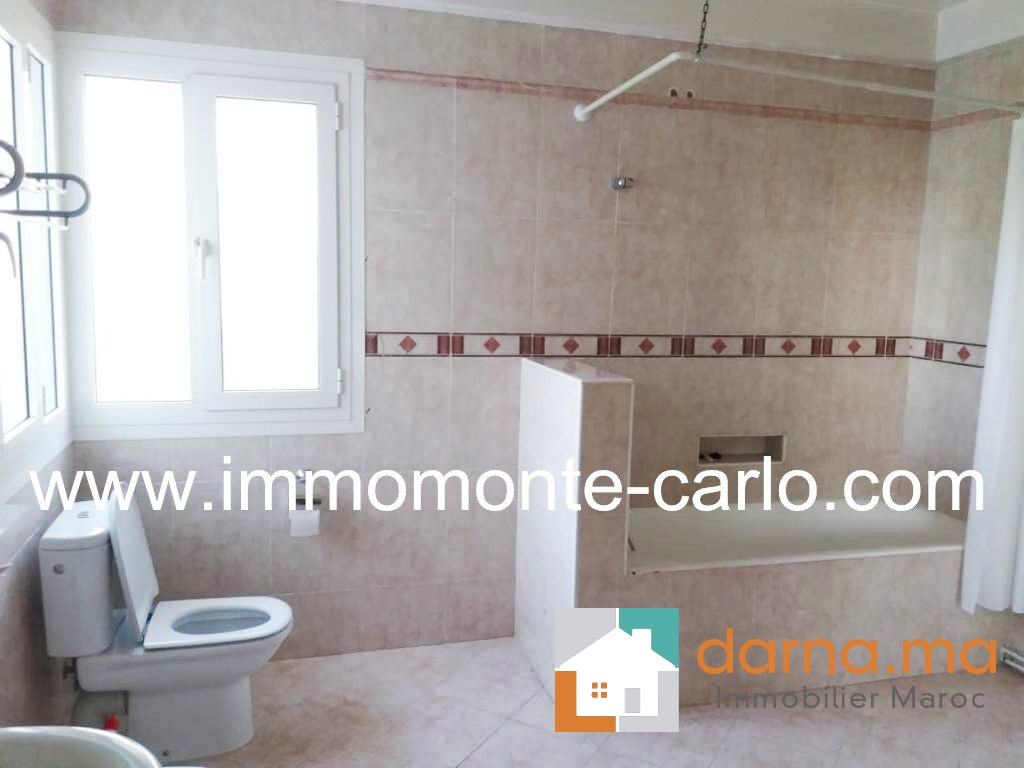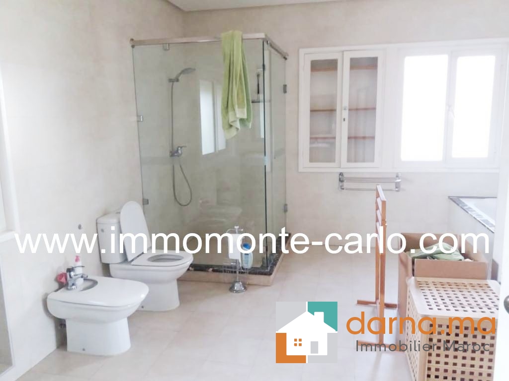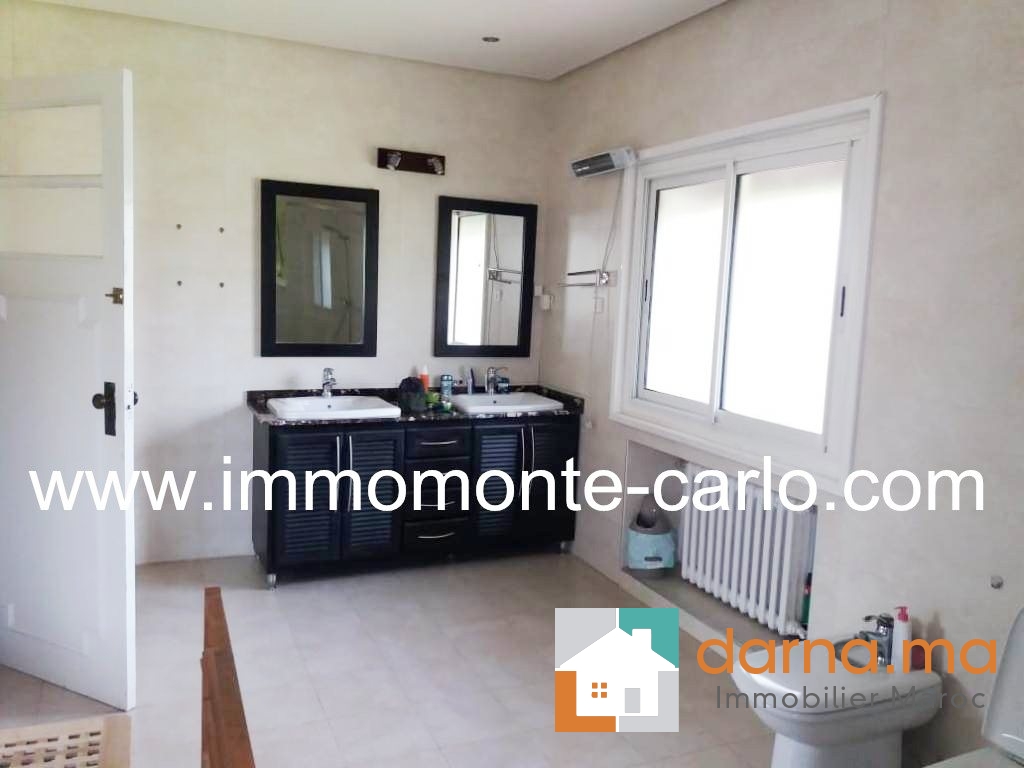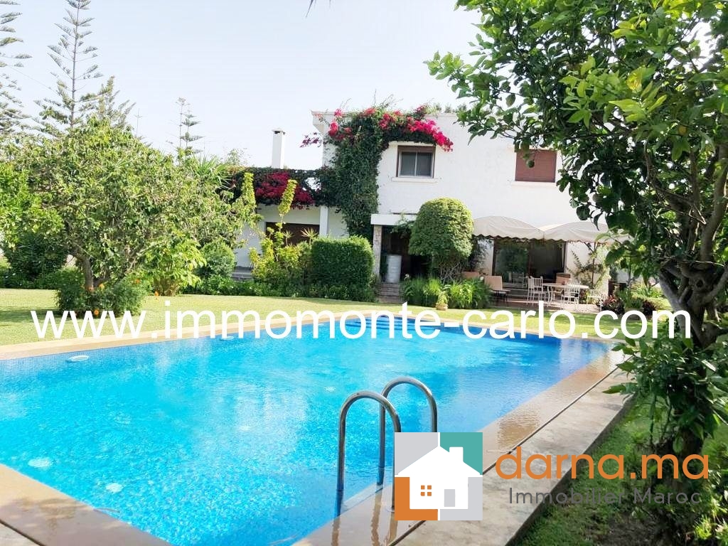 A louer villa avec piscine et chauffage central au quartier Souissi Rabat, ouvrant sur jardin arboré avec fruitiers (orangers, mandariniers, citronniers), très bien située en plein cœur d’un quartier résidentiel et proche de toutes les commodités( proximité écoles, transports,..). Calme, ensoleillée et bien sécurisée, elle se compose d’une belle réception donnant sur une magnifique terrasse avec vue sur la piscine et le jardin: double salons, cheminée, séjour, terrasse, 5chambres dont une chambre parentale avec salle de bain et dressing, bureau, 3 salles de bain, salle d’eau, cuisine équipée, buanderie, grand garage, débarras, chambre de service, pièce de rangement,