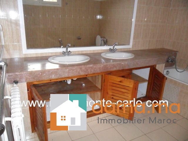 Agréable villa plain pied au calme avec piscine et double types de chauffages (chauffage central et électrique) et très beau jardin avec puits, garage, chambre de gardien avec douche, située au quartier résidentiel de Souissi proche de toute commodités et composée de double salons et un coin cheminée, un séjour, WC pour les invités, Hall, grande terrasse, une chambre parental avec dressing et salle de bain, un bureau, 4chambres avec salles de bain, une cuisine équipée et buanderie. Pour plus d’informations n’hésitez pas de contacter notre agence immobilière Immo Monte-Carlo au N° de tél: +212661464037 /+212661212547 ou Tél / Fax:+212537755043 ou par E-mail : Cette adresse e-mail est protégée contre les robots spammeurs. Vous devez activer le JavaScript pour la visualiser. ou visitez notre site www.immomonte-carlo.com ou rendez-vous au 15, Av. Al Abtal N°4 , Agdal RABAT MAROC.