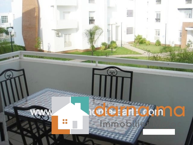 Location appartement meublé avec terrasse à Rabat à Bassatine Al Manzeh, 2Façades (Un balcon par façade) chauffage et climatisation dans toutes les pièces, sans vis-à-vis, immeuble avec ascenseur dans une résidence fermée avec jardin, sécurisée 24/24, dans un endroit calme et proche de toutes commodités, composé de 2 salons avec cheminée, séjour,  salle des invités, terrasse, suite parentale avec dressing, salle de bain et balcon, deux chambres avec salle de bain et balcon, une cuisine équipée, buanderie, débarras, garage.